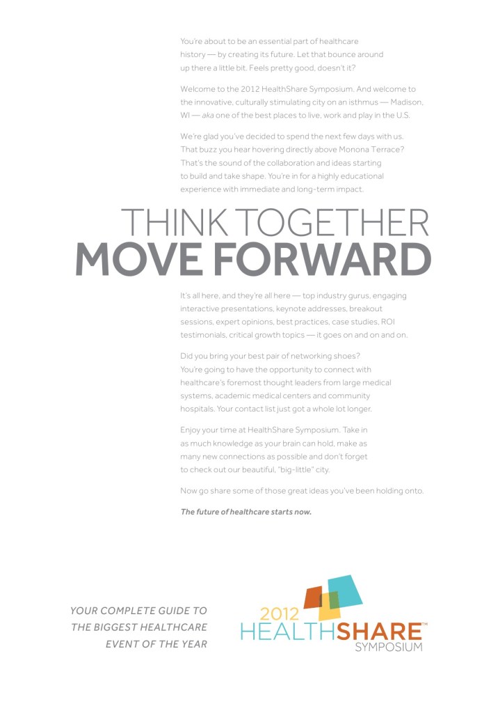 These are the first pages from a couple different program guides. Each year, HealthShare Symposium is the biggest event of the year. These guides are the go-to source of info for all attendees. Informative. Engaging. Loose. And always tied to a bigger theme.